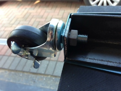 I decided to place some steel right angle inside the legs, and weld some plates to the top and bottom. I could get a bolt fixing at the top, and then use the bolt at the bottom that is used to attach the wheel.