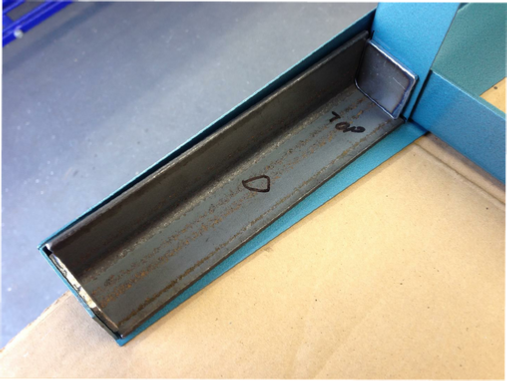 The angle iron was cut to the internal length between the cross member and the leg angle bracket minus the thickness of the two steel fixing plates which are yet to be made. Remember the plates will be 3mm thick each. I did find that the length varied, I guess because those cross member pieces were not a tight fit (see picture left) and simply relied on the 8mm bolt to hold them tightly together.