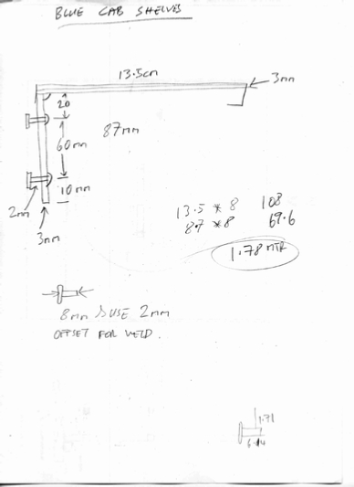 I had them cut this into pieces 13.5cm for the top of the bracket, and 9cm for the back of the bracket, where the nail heads will be welded. See my sketches below.