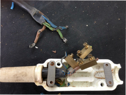 Now I found this, on the drill press extension lead. Clearly in need of replacement. However, I recommend all equipment in your workshop be PAT tested.