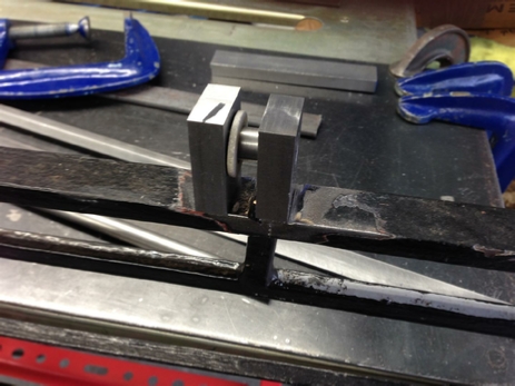 This is the jig (or one of them) now bolted in place, holding the pin and post hinge plate in place, ready to be welded.