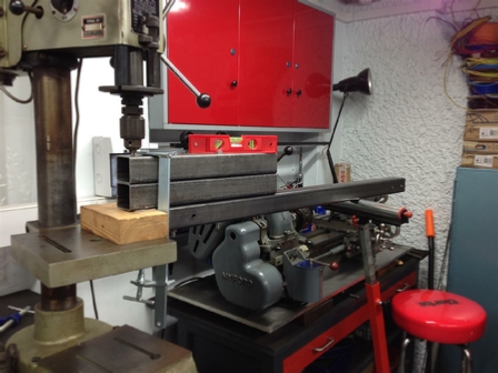 Notice the sprit level in use, and the clamp, holding the steel in place before drilling any holes.