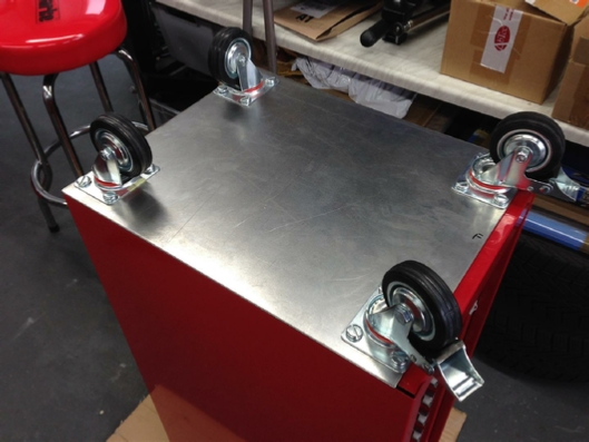 The finished cabinet, standing on it’s own wheels, ready to be filled with tools.