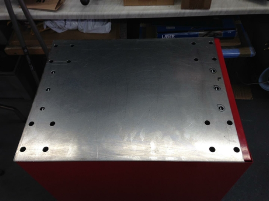 For the plug welds, we need to make out and drill some holes in the wheel mounting plate where the right angle frame will be.