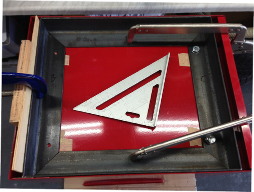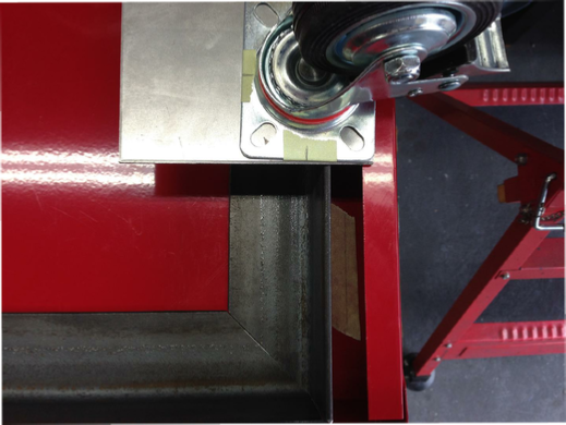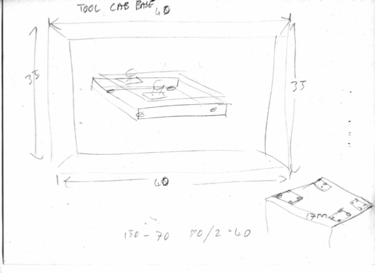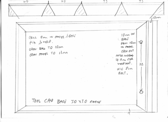 I have decided to use some 50x50x3 angle iron, cut to 45 degrees to form an oblong. Attached this to the spot welded cabinet base. Then and this is important, over cut the base metal by 1mm so that the sides of the cabinet will be take the weight on to the base and so through the wheels. This you MUST remember.