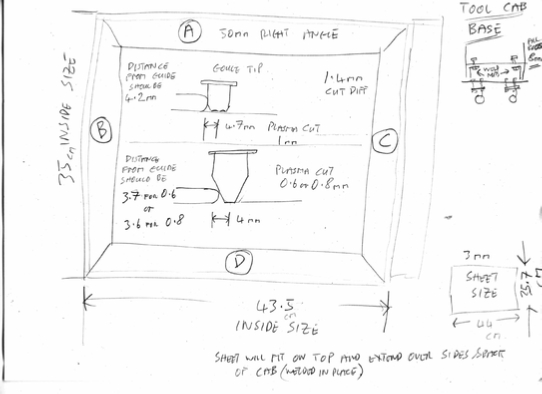 These dimension are going to be critical when we cut the wheel sheet, as it MUST give us exactly a 1mm overhang to take the cabinet weight for safety reasons. I also only have one sheet of steel so it has to be right first time. A lot to ask from my Cros-Arc 40!